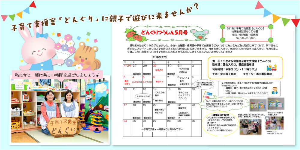 どんぐりつうしんは毎月発行しています♪子育て支援センターどんぐりのイベントスケジュールや子育て中のママ&パパに役立つ情報を掲載しています♪チェックしてみてね。 子育て支援「どんぐり」についてはこちらをみてね♪