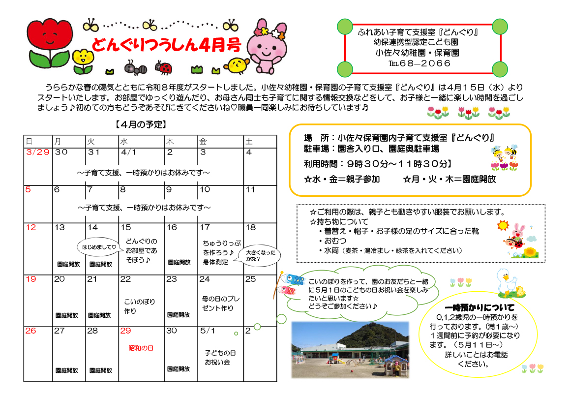 HOME > ふれあい子育て支援室「どんぐり」 > どんぐり通信 > どんぐり通信 2026年4月号 2026-03-28 どんぐりつうしんは毎月発行しています♪子育て支援センターどんぐりのイベントスケジュールや子育て中のママ&パパに役立つ情報を掲載しています♪チェックしてみてね。 子育て支援「どんぐり」についてはこちらをみてね♪ -どんぐり通信, ふれあい子育て支援室「どんぐり」 -2026, イベント, どんぐり, どんぐり通信, 一時預かり, 子育て支援, 子育て支援室, 未就園児対象