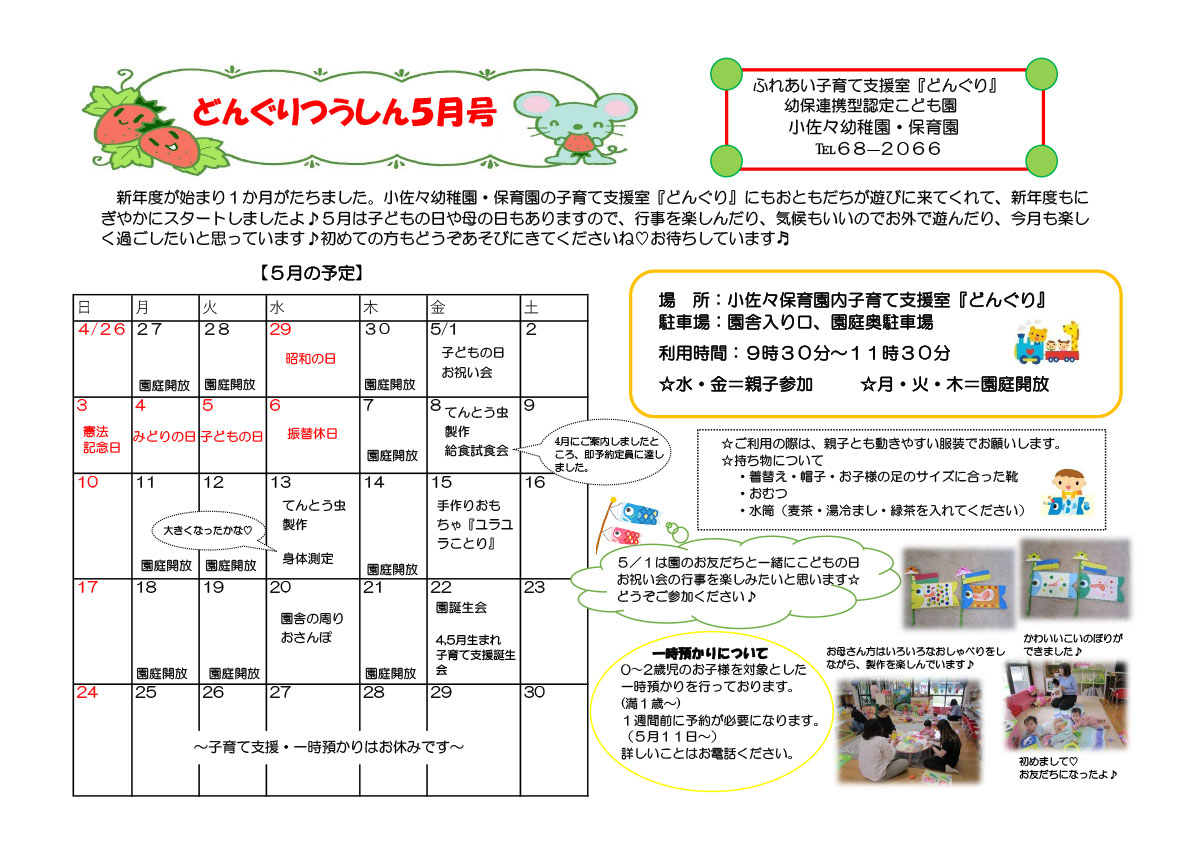 HOME > ふれあい子育て支援室「どんぐり」 > どんぐり通信 > どんぐり通信 2026年5月号 2026-04-28 どんぐりつうしんは毎月発行しています♪子育て支援センターどんぐりのイベントスケジュールや子育て中のママ&パパに役立つ情報を掲載しています♪チェックしてみてね。 子育て支援「どんぐり」についてはこちらをみてね♪ -どんぐり通信, ふれあい子育て支援室「どんぐり」 -2026, イベント, どんぐり, どんぐり通信, 子育て支援, 子育て支援室, 未就園児対象